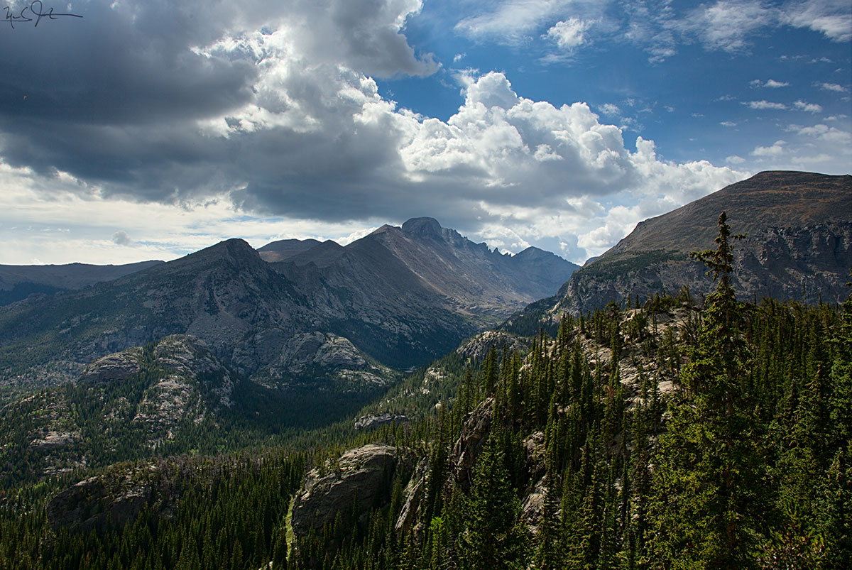 Afternoon clouds fore-sage a thunderstorm as they gather above the helmet of Long's Peak.